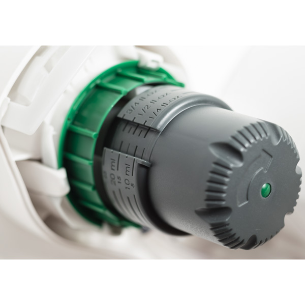 Para fijar una dosis en ECOSHOT, solamente tiene que girar el anillo verde hasta el indicador de dosis que corresponda. Este sistema le ofrece infinidad de volúmenes de dosis entre 5 ml y 30 ml para adaptarse a las necesidades de sus productos químicos.